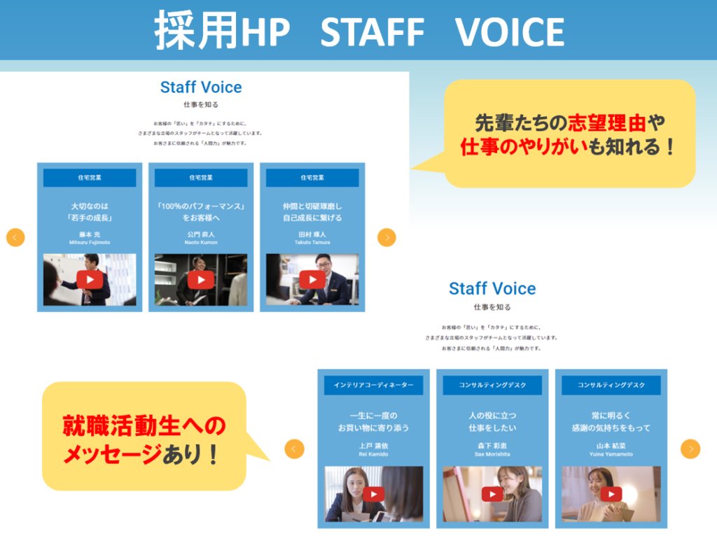 また当社採用HPでは実際に働いているスタッフの声・仕事内容の動画もあります。