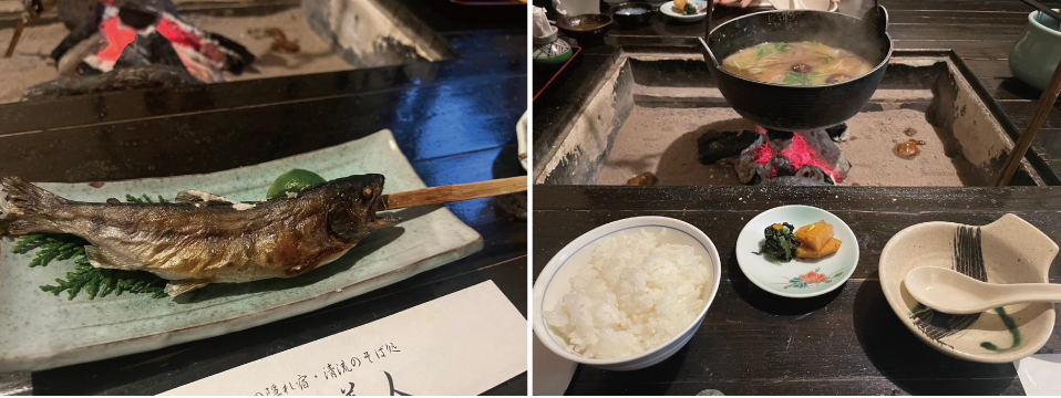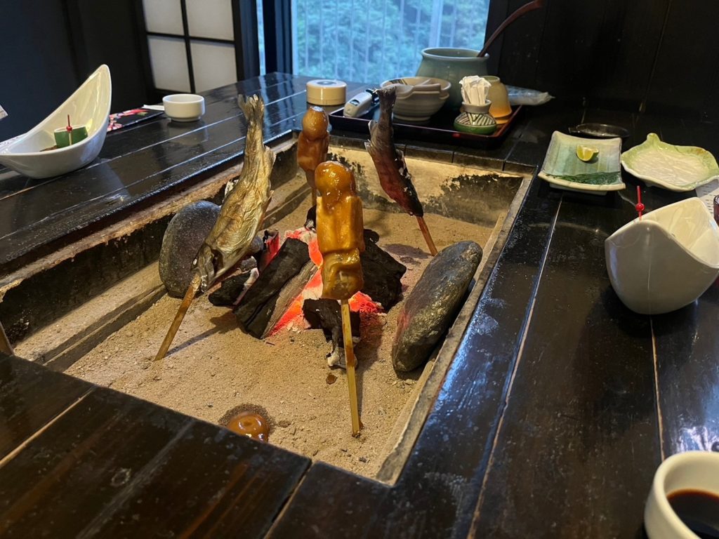 1つ1つの個室に囲炉裏がある食事処で、アメゴや鮎、ぼたん鍋等、